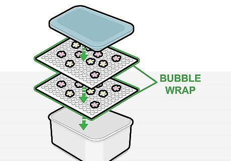 Add padding and drying packs to keep the flowers safe and dry. Some padding, like bubble wrap, is essential to keep very delicate flower petals safe from injury when in storage. If you don't have bubble wrap, you can also use paper towels. If you aren't completely sure that the flowers are dry, or if you live somewhere very humid, you can also add silica gel packs to wick any extra moisture away from your flowers. If you don't have silica packs, a piece of white bread placed inside the container with the flowers can also wick moisture away.