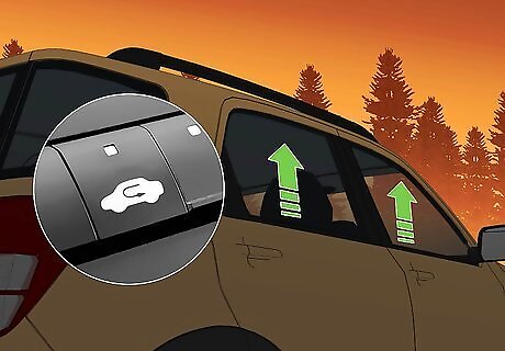 Roll up the windows and close the air vents. Make sure every window is completely closed. Shut your doors and close or block your air vents, and set your air conditioner to recirculate. You want to prevent smoke from getting into the car, as best you can—it can irritate your eyes and make it difficult to breathe, especially as the fire gets closer. Closing the windows can also help to keep out the heat.