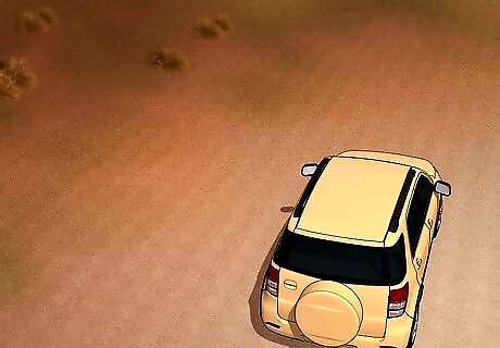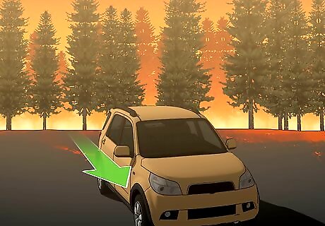 Pull over if you see flames approaching your car. If your way becomes blocked or you can see the fire moving towards you, pull the car over to a safe area, away from flammable materials like trees or brush. Look for a parking lot, driveway, dirt clearing or a rocky area to park your car in. As a last resort, you can stop your vehicle in the middle of the street, which is a hazard if a car approaches from behind, but is still safer than pulling over into a wooded area.
