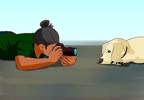 Get low to the ground. You can take some pictures looking down at your dog, but this is the normal human perspective. To make your photos interesting, try getting down on your knees or on your stomach and getting a dog’s eye view of the world. You can also take pictures from various heights. Take some pictures sitting on your knees, and take some pictures while you’re laying on your stomach. You can even take some pictures lying on your back with your dog looking down into the lens. Try to focus on your dog's eyes—sometimes the camera will focus on the fur, so the eyes won't stand out as much in the picture.