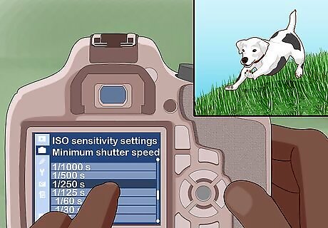 Set your shutter speed. If you are trying to catch your dog in a quick movement, such as in the middle of a jump, you’ll probably want to set your shutter speed to at least 1/250. This will keep the image crisp, and you can capture your dog doing something really cool. Slower shutter speeds may make it difficult to catch your dog in the middle of an action. Keep in mind that a faster shutter speed will not work well in low light conditions. If you want to take action shots, try to have your photo session on a nice sunny day. You can also use continuous shot mode, so when you press the shutter button down on your camera, it will take several photos in a row.