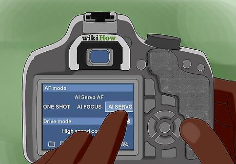 Choose Al Servo mode. Sometimes it can be hard to catch your dog sitting still. Unless you are taking photos where your dog is sitting still, you will probably want to use Al Servo mode on your digital camera. This mode causes your camera to lock onto the subject, but keeps refocusing so that moving shots won’t come out blurry. If you are photographing your dog when he is sitting still or when using flash, you should use One-Shot mode.
