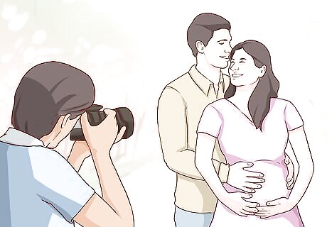Pose with your partner. Including your partner in your maternity photo shoot is a meaningful and poignant way to showcase the parents-to-be. Have your partner pose behind you with their hands gently wrapped around your belly. Stand sideways and look toward the camera, or look back into your partner's eyes to create an intimate, loving moment.