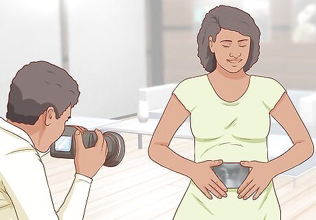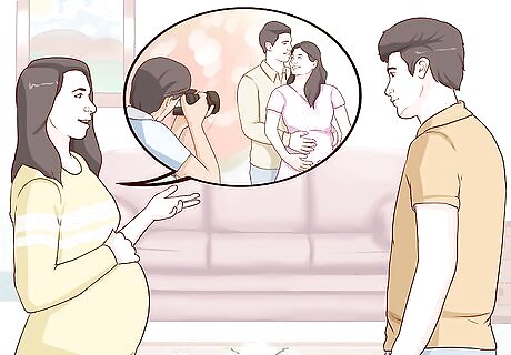 Talk to the photographer about your ideas. If you have a particular pose or setting in mind that you would like to include in your maternity photo collection, chat with the photographer ahead of time. Share your ideas and see if it is something they can accommodate. Be sure that your photographer knows your wishes in advance so they can plan ahead. Talk to your photographer about what locations interest you. “I was hoping to take some photos at my family's farm. It's about 40 minutes outside of the city. Would you be willing to travel to that location?” Be sure that the photographer is able to travel to the location you have in mind. Your photographer may have some unique locations and places in mind for your photo shoot. Chat with them to see if those locations interest you. “I would like to take some photos by the water. Do you know of a nice lake or stream nearby that might serve as a good location?” Your photographer may have a list of their favorite spots for you to choose from.