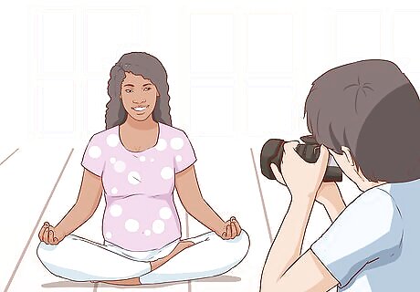 Incorporate yoga poses into your photo shoot. If you are an avid yogi and feel comfortable striking a downward dog while pregnant, try to include some yoga poses in your photo shoot. Posing in a fierce warrior pose will showcase your strength and will perfectly silhouette your baby bump. Facing the camera while sitting down in a lotus pose will highlight your belly and create a tranquil and mindful scene.