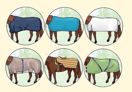 Use the right type of blanket. There are various kinds of horse blankets, each with its own purpose. Blankets should be breathable and waterproof as a rule, but otherwise they can be lighter or heavier and made of different materials like fleece, wool, mesh, and others. Make sure that you know what kind of blanket to use in the circumstances. Turnout blankets keep the horse warm and dry while outside, in cold weather and rain. They come in different weights and need to be waterproof. You can also use a rain sheet to keep your horse dry – these will be lighter than turnout blankets and can be lined or unlined. Coolers help cool and dry off horses after they’ve been worked out, by wicking off sweat. They can also keep the horse warm in its stall or while out walking. Flysheets are for keeping flies and other biting insects off the animal, not for keeping it warm. They’re light and made from mesh. There are also summer sheets, quarter sheets, and stable blankets. Summer sheets can give very light warmth when needed; stable blankets can keep a horse warm when stabled or turned out in dry weather.