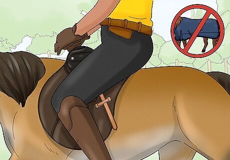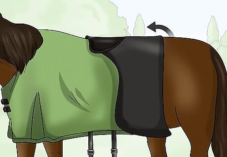 Take off the blanket if you plan to ride the horse. If you’re going to ride the horse, you will need to groom him and tack him up. You won’t ride him with the blanket. If it’s cold, though, you can put a cooler on him while you’re brushing him. In some cases, you can use a quarter sheet if you’re planning to ride. Quarter sheets only cover the horse’s back quarter. You can use them to cover its loins while warming up or cooling down, or to protect the horse from the rain while you’re riding.