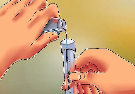 Add drops to the test water as an alternative. A few kits may ask you to add drops of liquid to your samples. In this case, you'll need a sample for each contaminant you're testing for. Add the required drops, and place the cap on. Shake it up, and then wait for it to develop. Compare the color with the cards that came with the kit to find out the levels of contaminant in your water.
