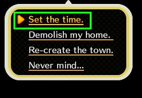 Get help. Instead of choosing “Yes, let’s” to get started as you do normally, choose “I need help first…” to reach another branch of dialogue. From this dialogue branch, Isabelle can either assist you with setting the time, demolishing your home, or re-creating the town.