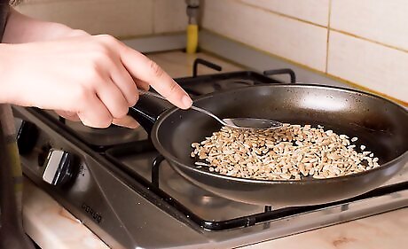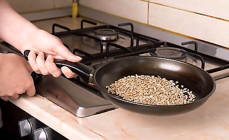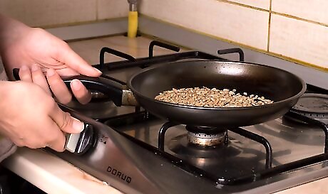 Stir the seeds in the hot skillet. While the pan is removed from the stovetop, stir the seeds to continue the browning process. If the seeds have stopped browning but you still need to toast a few more, briefly return the pan to the heat, keeping it there just long enough to apply a little extra heat. The entire toasting process should only take a couple of minutes.