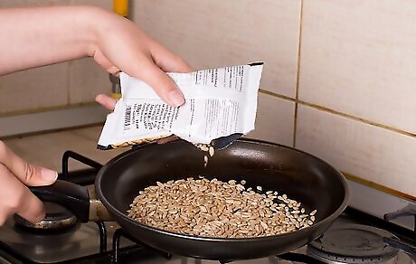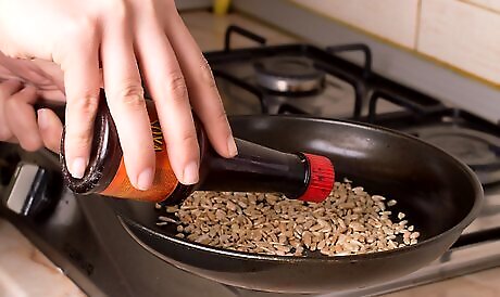 Pour the sunflower seeds directly into a dry frying pan. The flavor provided by oil or butter is not necessary for this method of preparation since you will get plenty of flavor from the soy sauce. Oil and other fats also help the seeds to brown or toast evenly, but even toasting can still be achieved without the use of fat as long as you are vigilant enough.