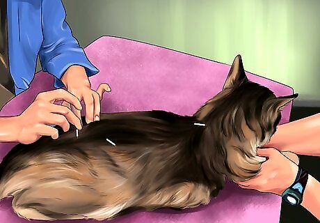 Use acupuncture in combination with traditional veterinary treatments. Acupuncture can be a great complementary treatment for cats that have serious health issues. For example, if your cat has chronic pain, using acupuncture in combination with other types of veterinary medicine, such as medication or physical therapy, can minimize the cat's pain and discomfort by strengthening its immune responses. Because acupuncture does not have any side effects, it can be used with all types of medication without the risk of complications or bad interactions. For this reason, acupuncture is also a great therapy for cats with other organ system problems that may not be able to take traditional pain and anti-inflammatory medications.