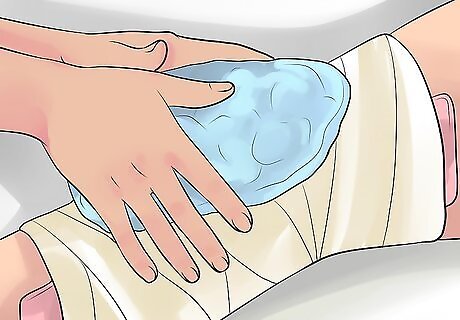 Apply an ice pack to reduce swelling and relieve pain. As quickly as possible following the injury, apply an ice pack to the site of the fracture. The cold from the ice narrows the blood vessels, helping to reduce blood flow to the injury and prevent excess swelling. The ice also helps to numb the pain. Hold the ice against the injured limb for 10 to 20 minutes, then take a break to allow the skin to warm up before reapplying. Make sure to wrap the ice pack in a clean cloth or towel — the ice should never come in direct contact with the skin, as the extreme cold may cause tissue damage. If you don't have an ice pack, a pack of frozen vegetables will do nicely. Never apply a heat pack or warm compress to the injury, as this will increase blood flow to the area, increasing swelling and pain.
