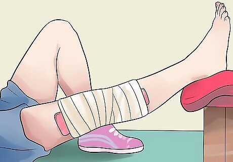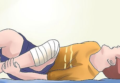 Elevate the fractured limb. If it is possible to do so without causing further injury, try to keep the injured limb elevated above heart level. This reduces blood flow to the area and prevents swelling. If the injured person is lying down, you can prop their fractured arm, hand, leg or foot on a stack of pillows or cushions.