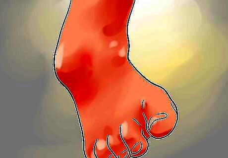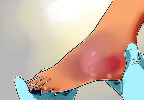 Look for signs of swelling or bruising over a bone. If a closed fracture has occurred, you should be able to see signs of swelling or bruising at the site of the injury. Bruises appear when blood vessels beneath the skin break as a result of extreme force or a blow to the skin. Blood leaks out of these blood vessels, resulting in red, black or purple marks on the skin. Swelling occurs when the body’s immune system releases inflammatory chemicals through the blood in order to eliminate harmful stimuli around the site of the injury, such as irritants, damaged cells, and pathogens. This allows the body to start the healing process.