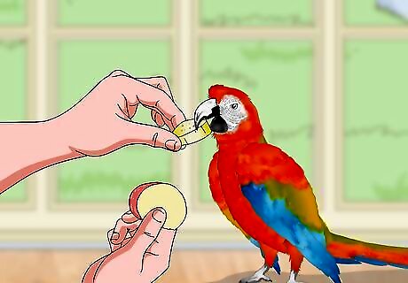 Give lots of treats by hand. Macaws are especially likely to bite your hand, since that is how you interact with the bird. If you give your friend lots of treats by hand, however, it will come to expect good things when you reach toward it, reducing the chances of a bite. Macaws will love treats like sunflower seeds, almonds, and banana. If the macaw bites often, offer treats on a wooden spoon. Praise your pet when they take the treat nicely. Over time, inch the end of the spoon closer to your hand until your macaw can take the treat without hurting you.