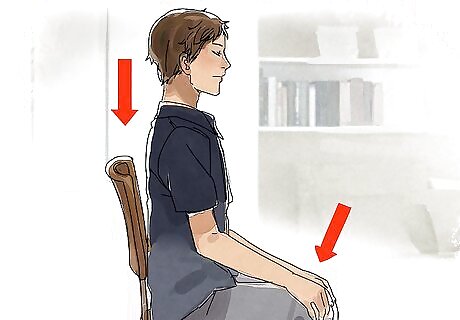 Sit upright. Some studies have shown mindful meditation is effective in combatting depression, and is particularly effective in preventing relapse for those who have experienced episodes of major depression. To practice mindfulness meditation, you'll first need to sit upright on a chair or on the floor. Choose a room without distractions. It might be best to choose a particular corner of the room. Do not face anything stimulating, like a television set or window. Try to face a blank wall if possible. Sit in a manner that feels comfortable. You want to be able to focus on your breath and self rather than feelings of physical discomfort. You can sit on the floor, a cushion, or a chair with a straight back. Make sure you choose a chair that does not wiggle around. Try to sit up straight when you're meditating in order to make breathing easier. Place your hands on your thighs, facing downward. Keep your eyes somewhat opened, with your gaze focusing on the wall or floor. Make sure your hips are higher than your knees.