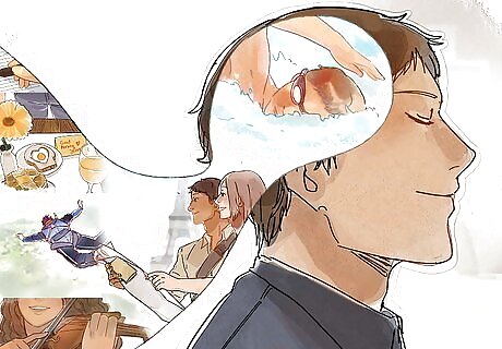 Let thoughts flow through you. After a few minutes of breathing, allow your mind to wander. Do not judge or analyze your thoughts. Just let them come in and out naturally. Thoughts will begin to arise if you meditate long enough. They might be memories, worries, concerns, or snippets from TV shows. Try not to control your thoughts. Just let them come and go on their own. Avoid judging your thoughts or trying to work through or analyze anything. Simply let the thoughts occur. It can be helpful to name your thoughts in your head as they come. Think something like, "Here is a memory from childhood," or, "Here is some worry about my job."
