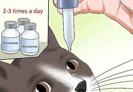 Follow your veterinarian's suggestions for treatment of eye pressure. Medical treatments involve drops applied to the eyes that work to limit liquid in the eye. Unfortunately, they are less effective in more pronounced glaucoma, and work best when given as a preventative treatment for a healthy eye that is at high risk of glaucoma, or when a problem is spotted early. Medicines used for treatment include: Dorzolamide 2% drops: This is a carbonic anhydrase inhibitor that works by reducing the production of aqueous humor. This is the most effective treatment for cats and is generally applied 2 - 3 times a day. Timolol 2.5%: This contains a beta blocker that encourages the drainage of aqueous humor out of the eye. It is applied 2 - 3 times daily but there is a slight risk, in some cases, of it lowering the heart rate and blood pressure. Topical steroid drops: These decrease inflammation and so if the glaucoma is due to inflammation in the eye, taking that swelling down can improve drainage. The vet will carefully assess the patient to see if this is an appropriate treatment, since in some cases it can cause an increase in IOP. Ocu-Glo: This is a complementary therapy, drops containing antioxidants which help nourish the cells responsible for draining fluid from the eye, which helps them to function with maximum efficiency.
