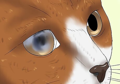 Look for the physical symptoms of glaucoma. Hold your cat still and look at its eyes. One clear sign of glaucoma is that eye appears bigger than the other. This enlargement is caused by the pressure building in the eye. Also, the cornea may take on a misty or blue appearance as it stretches. The pupil may also be round and dilated.