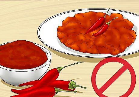 Avoid spicy foods. Eating spicy food does not cause peptic ulcers, but it can worsen your stomach irritation when ulcers are present and make pain more severe. Limit your spicy foods to improve symptoms. Eating and drinking foods that increase stomach pH (make it less acidic in your stomach) can also help with pain. Milk, for instance, may decrease symptoms temporarily.