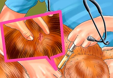Allow your vet to do a physical exam and run tests. If your cat displays the symptoms of urinary incontinence, including an inability to urinate, bloody or cloudy urine, a loss of bladder control, or straining or crying out in pain when urinating, you should take them to the vet right away. Getting your vet to diagnose the issue will ensure your cat gets the right treatment. Your vet will do a physical exam of your cat, including looking at their abdominal area. They may also run several tests to determine the cause of your cat’s bladder problems. Your vet may run a urinalysis, where they will test your cat’s urine for bacteria as well as red or white blood cells. Your vet may also do an x-ray of your cat’s abdominal area to check for bladder stones. They may inject your cat with a special dye so the bladder is easier to see in the x-rays.
