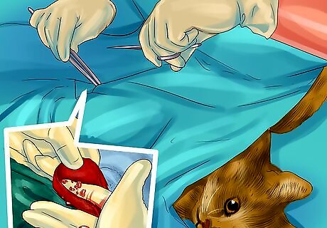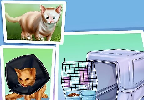 Help your cat recover after surgery. Your cat may need some tender loving care after their surgery to ensure they recover well. You should limit your cat’s activity so they can heal. Keep your cat indoors, such as in a crate or a small room in your home. You may also avoid giving your cat a bath so the incision area does not get wet. Try to examine the incision area often to ensure it is healing properly. You may need to get a pet cone so your cat does not try to lick or pick at the incision area.