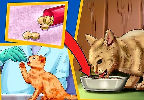 Give your cat the necessary medication. You should make sure your cat gets the medication prescribed to them by the vet, such as antibiotics for a urinary tract infection. Follow your vet’s instructions on dosage and make sure your cat consumes the medication. If your vet prescribes medication in pill or capsule form, place the medication in the center of a small ball of canned cat food or a piece of cheese. Try to get your cat to swallow the small ball with the medication whole, as they may not want to eat it if they bite into the medication and it leaves a bad taste in their mouth. You can also try to place the medication in your cat’s mouth directly, though you should use caution as you do not want to get bit by your cat. To do this, hold your cat’s head from the top with your non-dominant hand, placing your fingers around your cat’s cheekbones. Then, tilt their head back so their jaw falls open. Use your dominant hand to put the medication far back on your cat’s tongue. Then, shut their mouth and stroke their head or blow in their face to encourage them to swallow the medication.