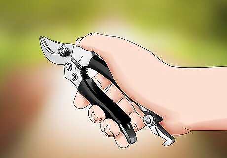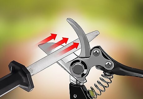Sharpen your pruners if necessary. Dull pruners can make the process take longer, and they can lead to ugly, uneven cuts. Secure the pruners into a vise. Then, run a file along the blade of the pruners until the edge becomes sharper and more defined. Wipe the shears down with linseed oil when you’re done to help prevent rust.
