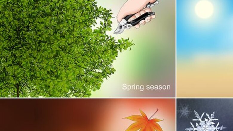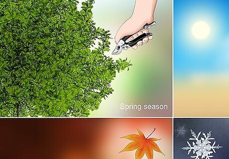 Prune in the spring. The best time of year to trim evergreen bushes is before new growth occurs. Early spring is usually most convenient, but you can also trim the bushes in late winter if it’s not too cold for working outside.