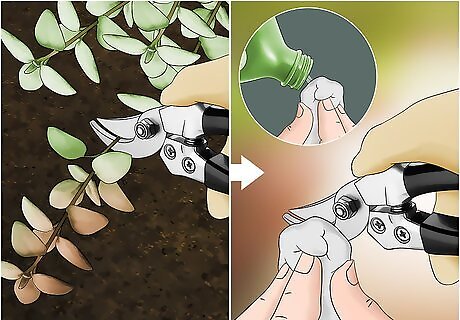 Cut off any damaged or dead branches. Any branches that are discolored, bare, or limp need to be removed. Take the branch in 1 hand and use your other hand to cut it off at the base of the stem with your pruners. If the base of a stem is particularly thick or tough, try using larger shears or a small hacksaw. Wipe down the blade of your pruners with rubbing alcohol after you cut off a diseased branch. This will help prevent the disease from spreading to other branches.