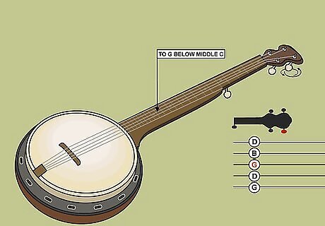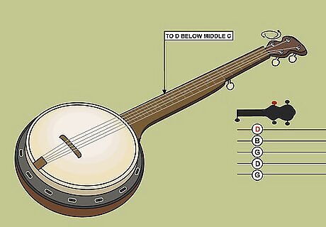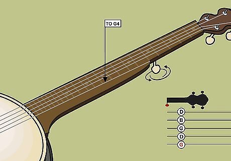 Tune the middle string of the banjo to G below middle C. Look at the five strings at the bottom, and find the center string. This is the first one to tune. Follow the middle string to the top of the banjo, and find its corresponding tuning knob. Tighten or loosen the knob and pluck the string as you do so, until it is tuned perfectly to G3. This pitch is called G3. Each octave on a keyboard is assigned a number, and middle C is referred to as C4. So, the G below C4 is G3.