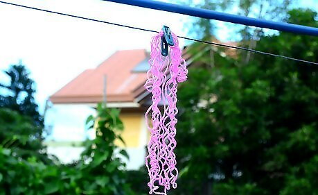 Hang it up to dry. Once you’ve squeezed out the water from the yarn, hang it up. You can choose to hang it anywhere you’d like, such as from a kitchen cabinet handle, a shower rod, or even on a clothesline. Allow the yarn to dry completely before using it for a project. If needed, you can hang weights from the bottom of the yarn in order to further straighten it. A can of soup works well, but don’t use a weight over 2 pounds (0.91 kg) or you risk damaging the elasticity of the yarn.
