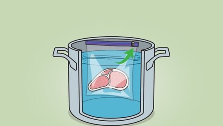 Yes, you can vacuum seal food using a tub of water. Place the item you want to store in a ziplock bag, and seal the bag up to about an inch (two or three centimeters) from one edge. Submerge the bag in a large pot of water until only the unsealed corner sticks out of the water. Pinch the corner closed when the water forces most of the air from the ziplock bag. You can also: Place the item you're storing in a ziplock bag, then put a straw into the bag. Seal the bag, leaving only room for the straw to protrude from the opening, then suck the air out of the bag through the straw. Place the item you want to store in a ziplock bag, close the ziplock seal, but leave a corner of the bag unsealed. Place that bag into a larger ziplock bag. Insert a vacuum hose into the larger bag, then seal the larger bag around the vacuum hose.