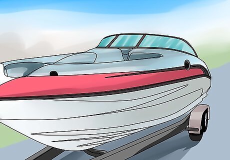 Position the boat on the trailer securely. Boats should be waxed out of the water, secured on the trailer, preferably parked on a flat, even surface. Because you'll be spraying products and moving all around the boat, you'll probably not want to have the trailer attached to your car, either. Depending on the style of your boat, you'll probably want to put the cover on before you get started waxing and cleaning the boat. To keep the interior safe, keep the cover on.