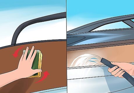 Wash with a proper detergent. Finish washing the surface with a sponge and special boat soap or a mild solution of dishwashing detergent and warm water. If the surface of your boat is stained, it's sometimes common to use a small amount of bleach to disinfect and clean thoroughly. It's also sometimes common to use lacquer thinner, Varsol or a special degreaser to remove sticky adhesive spots or greasy buildup. Don't use bleach on untreated or unstained wooden boats. Rinse the boat thoroughly with clean water and allow to dry. You can use a squeegee to speed up the drying process, if necessary.