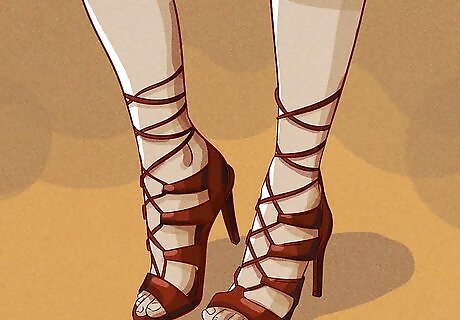 Choose strappy heels to show off more skin. It’s normal to want to show off a little more skin at night, and strappy heels are the perfect way to do that. Pick a pair of heels that are still comfortable to walk or dance in, if that’s what you’re doing. Try black heels for a monochrome look, or nude heels to make your legs look longer. As another option, pick a colorful shoe, like a bold red or hot pink. Pattern also works well for the evening, so you might break out your leopard print strappy heels. Similarly, studded or jeweled heels also work great.