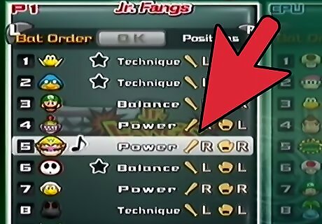 Now adjust your batting order. You want fast and reliable players in the first and second spots. You should have more balanced players in the third spot, your big power hitters in the fourth, fifth and sixth spots. Characters that you don't trust as much with the bat, or that just don't fit anywhere else, fill in the seventh, eighth and ninth spots. Here is a mock lineup... 1. Speed Player 2. Speed/Technique Player 3. Balance/Power player 4. Power Player 5. Power Player 6. Power/Balance Player 7. Balance/Technique Player 8. Technique Player 9. Speed Player