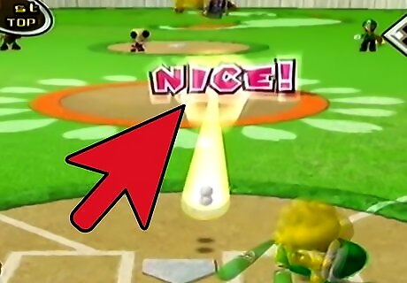 Batting: Only use the charge swing occasionally, preferably only with your power hitters. Using the charge swing with a character with weaker batting skill usually results in a fly-out. If you have good timing and practice enough, you can hit bloop singles (base hits that drop between the infielders and outfielders) with almost any player. Home-runs and Big Hits: If you want to hit a homer, you have to position your batter just right and have perfect timing. You want the ball to hit the sweet spot of the bat (usually near the middle, where the bat's logo is) when the bat is perfectly parallel to the ball.