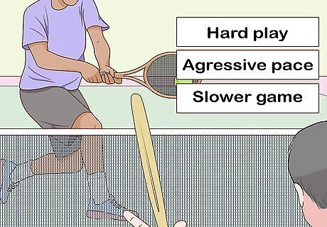 Dictate the speed of play yourself. Notice whether your opponent prefers playing at a hard, aggressive pace, or if they prefer a slower game. Determine the pacing of the game by accelerating the match speed or slowing it down when you can, both during play and in between sets. Determining the speed will throw your opponent off and make them uncomfortable, giving you a significant advantage.