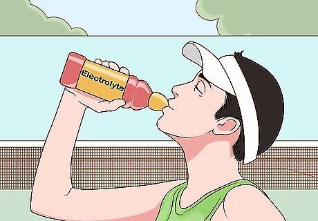 Stay hydrated and calm in between matches. As you progress through the tournament by winning matches, focus on staying collected during your resting periods. Hydration is vital to maintaining peak athletic performance. Drinks with electrolytes, which are found in most sports drinks, will keep you hydrated between matches. Drink a half of a cup, or .12 liters (0.032 US gal), of water every 15 minutes to stay hydrated during the match.