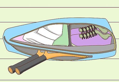 Bring all the necessary tennis gear to the match. A week before the tournament, assess what gear you do not already have. Consider purchasing new gear, like a racquet or tennis shoes, if what you have is worn out or old. Assemble your gear, including comfortable clothes, tennis shoes, and a racquet, and place them in a bag so that you won’t forget anything. Tennis clothing should fit comfortably and be breathable to limit sweating. Cotton shirts will keep you cool if it is hot out, and provide warmth if you are playing in the cold. Tennis shorts can be purchased at any sporting goods store and are specific to the sport, preventing the buildup of moisture while looking professional. Headbands and wristbands are important to keep sweat out of your eyes and off of your hands while playing. Proper tennis shoes are an important investment and should always be worn with moisture resistant sports socks. Bring a towel to wipe the sweat from your face and arms in between play. If the tournament does not supply tennis balls, bring your own for the match and for warming up.
