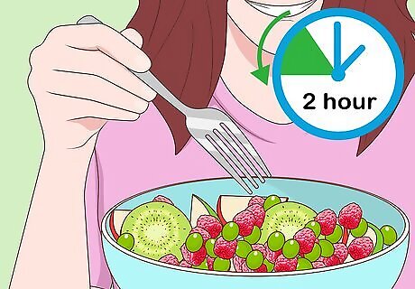 Eat a balanced meal two hours before the competition. Give your body time to digest and store your food as energy by eating a vegetable, fruit, and carbohydrate-based meal well before the competition. Bring snacks, like fruit, a small lunch, and plenty of your own water or sports drinks if you are playing more than one match in a day. Good meal options before a tennis tournament include a banana with oatmeal, a fruit smoothie containing strawberries and bananas with a protein supplement, or a whole grain piece of toast topped with jam and an assortment of nuts.