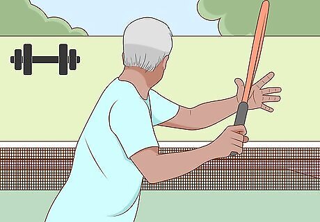 Arrive at least thirty minutes early to warm up. Before your first match, it is important to warm up properly to avoid injury and prepare your body for the competition. Go for a five minute jog before your match to loosen your muscles and increase your heart rate. Stretch your major muscles groups, like your quads and back muscles, before the match to increase flexibility and help avoid injury. Practice static stretching of all your major muscle groups, including your quads, hamstrings, upper and lower back, and chest muscles for five minutes after a cardio warmup.