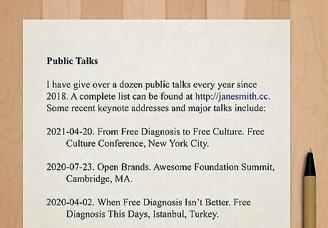 Divide all other relevant information into specific categories. You have to include education and work experience. The rest of it depends on you! The way you organize your CV for medical school is determined by how much and what type of information you have to share. Categorize it so that your CV is easy to follow. If you do not have information for a specific category, leave that section out. CVs can have several specific categories, including training, teaching, workshops, seminars, research, lectures, conferences, publications, degrees, continuing education, scholarships, fellowships, volunteer experience, appointments, and more. You can add or drop certain headers as needed. So long as you cover your education and work experience, the rest is up to you.