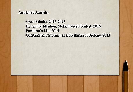 Mention any organizational relationships or accomplishments. Use your own judgement here to determine whether an award or membership is worth mentioning or not. If you’re a part of any student organizations that focus on medicine, include it. If you got an award for creative writing, it’s probably not relevant, though. Include academic awards! Graduating as valedictorian, or magna cum laude is impressive. Again, use reverse chronological order.