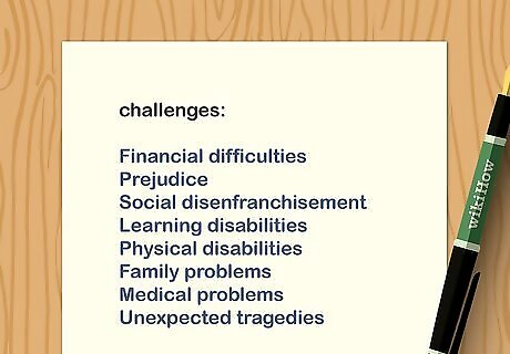 Describe any challenges you have faced. Challenges and difficulties can help foster interest in your story and make you more endearing. Everyone loves an underdog, and many people will be willing to assist you if they see that you have already worked hard to reach your current position. Possible challenges to explore include: Financial difficulties Prejudice Social disenfranchisement Learning disabilities Physical disabilities Family problems Medical problems Unexpected tragedies