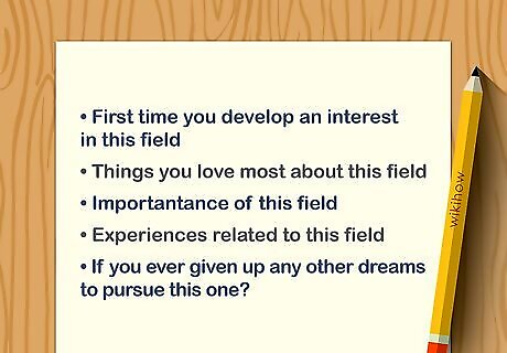 Outline how you reached this place in your life. Jot down a list of experiences and turning points in your life that led you to develop your current career or academic interests. Questions worth asking yourself include: When did you originally develop an interest in your field of choice? What do you love most about your field of choice? Why do you think your field of choice is important? What experiences have you had that have provided you with experience in the field? Have you given up any other dreams or expectations in order to chase after this one?