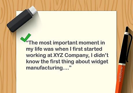Create a strong beginning. Your first paragraph must grab the reader's attention. A strong introductory paragraph will clearly introduce the thesis or theme of your personal statement while creating a sense of narrative as if you're introducing a story. Use a personal anecdote to hook your readers. Avoid starting with common or cliché phrases like, “The most important moment in my life was when...” A better way to introduce that “important moment” would be to simply start describing it. Explain that, “When I first started working at XYZ Company, I didn't know the first thing about widget manufacturing.” Directly break into the narrative instead of alerting the reader that you intend to do so. Provide as much detail in the first paragraph as possible. Introduce the main idea of your personal statement and describe how it connects to your narrative. Save any elaborate details or related notes and experiences for the body of your essay, though.