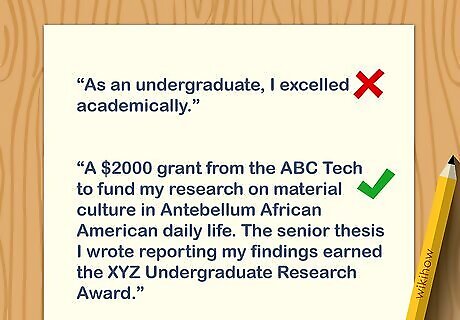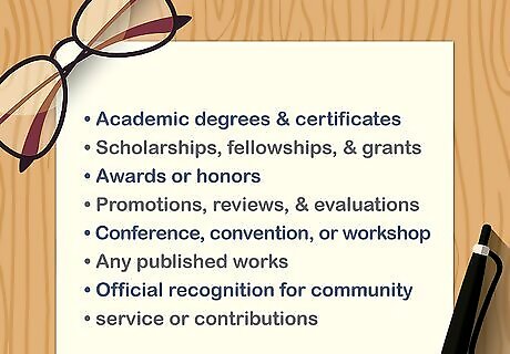 List your formal achievements. While you should not include a straight list of achievements in your personal statement, some of your most significant achievements deserve to be mentioned. Writing out a list of your achievements will help you to recall each one and determine which to include. Formal achievements can include: Academic degrees and certificates Scholarships, fellowships, and grants Awards or honors from academic institutions (e.g. summa cum laude, manga cum laude, departmental honors, Dean's List, etc.) Workplace promotions, reviews, and evaluations Speaking at a conference, convention, or workshop Published works in your field of expertise Official recognition for community service or contributions